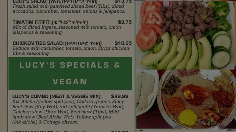Had the most wonderful dine-in experience at Lucy's tonight! We started with delicious meat-filled Sambusa. Light and crispy with perfectly seasoned meat filling! Then for our main meal we had Lucy's Combo which was a sampling of Lucy's specialties including beef, chicken, and lamb. Meats had a variety of seasonings and all were amazing. The combo also included lentils, split peas, and collard greens. The food was all made from scratch and Aster, restaurant owner, takes pride in preparing recipes she learned from her mother as she grew up in Ethiopia. She even served us tonight and made us feel right at home. My husband and I highly recommend! Bring your friends!