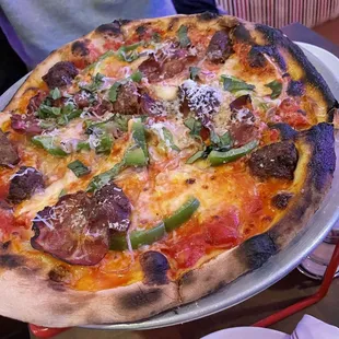 Charred and overcooked pizza had bitter and burnt flavors. And the high cooking temps and short baking time resulted in dry meats and undercooked veggies. Crust was black on the edges and the bottom. I asked if this was how their pizzas were normally done, and the server said that they it was. The pizza did come out very fast and the service was very friendly. But the pizza was overcooked and over salted.
