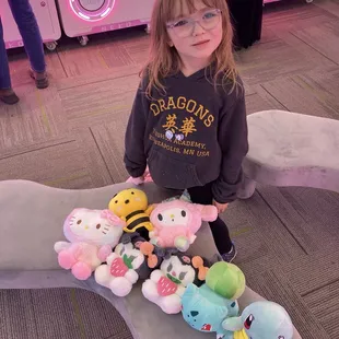 Very fun and addicting! It is a small establishment in Roseville on Lexington, south of Hwy 36. The place was clean and organized. The staff members were friendly, professional, and approachable. They have a machine where you can convert cash into tokens. Otherwise, you can buy tokens from the staff at the counter with a debit/credit card, as well as cash. Each machine takes 1 token. Each claw machine has a timer from 20-30 seconds. They also have a bag for all of your winnings. The plushies are good material, well made. Each plush is consider 1 credit. You can trade in the plush for an item behind the counter. I saw a staff helping this little girl by opening the machine, placed the plush right by the drop, closed the door and let the little girl play in hope to win. Overall, I had fun. I spent $80 and won 10 plushies; but traded 4 plush in for this cute Kuromi.