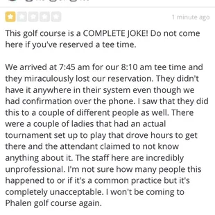 This golf course is a COMPLETE JOKE! Do not come here if you've reserved a tee time. We arrived at 7:45 am for our 8:10 am tee time and they miraculously lost our reservation. They didn't have it anywhere in their system even though we had confirmation over the phone. I saw that they did this to a couple of different people as well. There were a couple of ladies that had an actual tournament set up to play that drove hours to get there and the attendant claimed to not know anything about it. The staff here are incredibly unprofessional. I'm not sure how many people this happened to or if it's a common practice but it's completely unacceptable. I won't be coming to Phalen golf course again. Give Keller Golf Course a try instead!