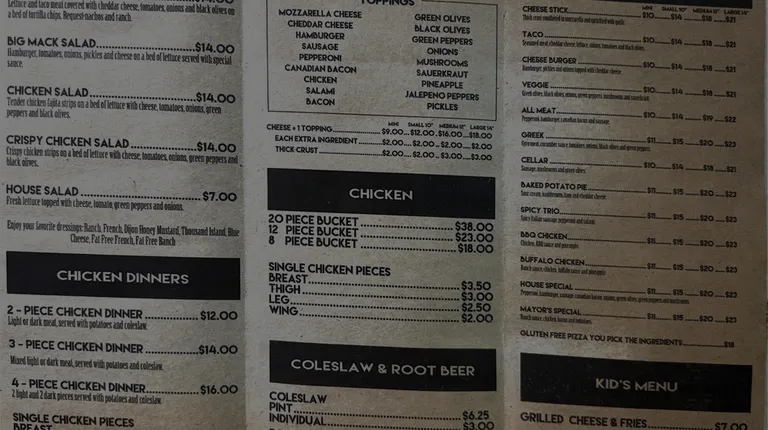 The food is excellent. There pizza actually is better than big chain pizzas and KFC could learn a few things about quality. The service is excellent and the ambience is very small town and quaint.Overall this town and area are lucky to have such a great place.