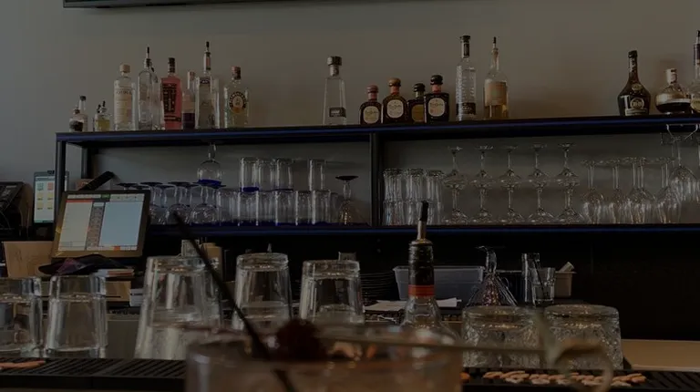 Front bar area with high top and very high ceilings