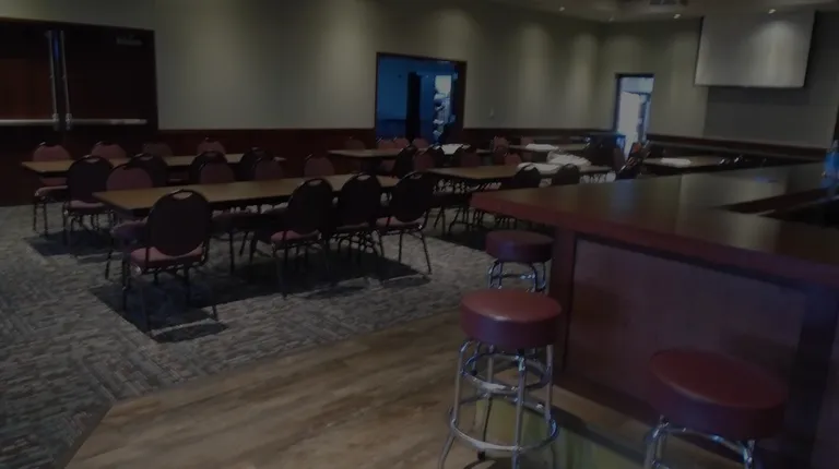 Outside of the banquet hall area to the left of the bar, view looking east.