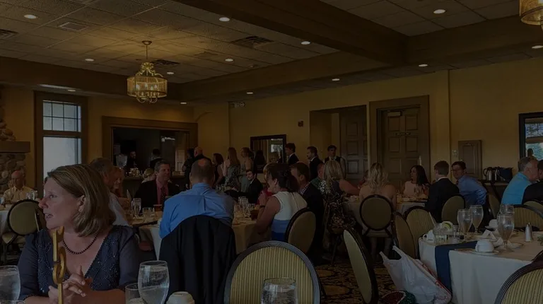 Pros:Beautiful club and views of golf course Spacious banquet roomOutdoor seating available Great bar tender Bathrooms are downstairs and easy to get toCons:Food served came out cold and sauce was congealedLayout of banquet room was awkward - dance floor at one end and dining table at the other had a speaker right behind it. I felt bad for the people seated there.Salad was overdressed and lettuce wiltedParking was difficult - few spacesPro tip:Head outside to take photos on the 18th at sunset