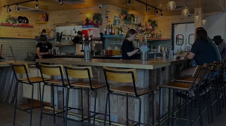 a bar with stools and tables