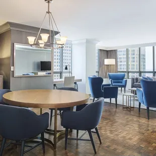 A large group of us came to Minneapolis for a convention and most of us stayed in this hotel. It was a wonderful experience staying here for our week. My wife and I arrived very early... 10:30 AM early. Being Hilton Honors members we were allowed to check in at that time. Not a suite or oversized room... Just a very nice room on the 12th floor. It was a very reasonable sized room with a very comfortable bed and pillows with a nice size bathroom and walk in shower. The room had very large wrap around windows with a wonderful view of downtown Minneapolis. Directly across the street was the Wells Fargo building. As you walk in to the hotel off the street the main bar is straight ahead while the reception desk is to the right. Before you reach the reception desk, you'll walk past several very casual and comfortable seating areas. There's even a billiards table there. The bar / restaurant area always seemed very busy, especially in the evening when we came back from dinner. The bartenders and the servers were very friendly-outgoing-efficient. Overall, it was a great place to sit with my friends to relax / converse and laugh.The Breakfast Area / restaurant is on the 3rd floor. While I never came here for breakfast or lunch, my friends who did had nothing but great things to say about it. The hotel is located in the middle of everything - business and touristy places. Plus, the hotel is only one block away from the Mary Tyler Moore statue which I have visited multiple times. It was nice that we were only a ten minute walk from the convention center where most of my events were. Overall, this is an excellent hotel and I highly recommend it. KUDOs to the team at the The Marquette Hotel