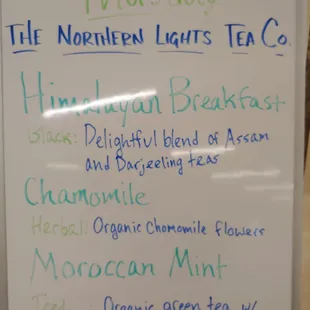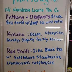 a white board with a list of teas