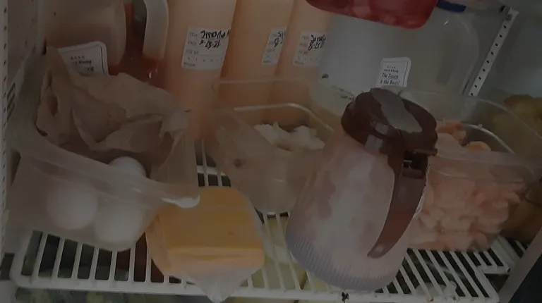 Uncovered cooked meat below raw chicken. Food "stored" on the floor