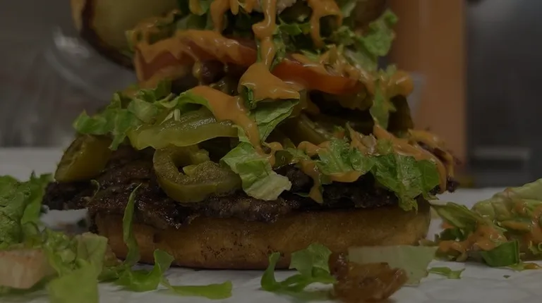 Here, we have a two patty smash burger in the back and a three patty burger cut in half!
