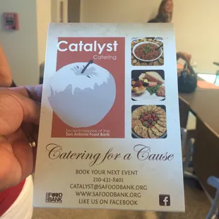 Catalyst Catering is a catering service run by San Antonio Food Bank. The food bank uses purchased foods ( not donated ) for their catering. Culinary students who are receiving their 18 week training at the Food Bank prepare entrees, hors d' oeuvres , desserts and drinks for customers. My workplace had a retreat and I had the opportunity to try the delicious food made by the culinary school. Catalyst catering has a large menu that an event planner can choose from. Our group was catered breakfast and lunch. Breakfast consisted of fresh fruit ( pineapple, strawberries, red and white grapes) , fresh coffee, OJ, mini cinnamon and cherry Danish pastries as well as breakfast tacos. I came late so I missed out on the breakfast tacos, but those pastries were to die for along with the fresh fruit. Lunch included Panko crusted baked stuffed chicken with a vegetable medley and beef pot roast with roasted garlic and bacon mashed potatoes. I tried both and they were both delicious. The only complaint was the sliced potatoes in the pot roast were very salty. Dessert included these wonderful Apple and cherry pies with a delicious crust. Looking at the prices on their website catering is incredibly reasonable-$14 for a pie that serves 8 people, breakfast tacos ( 2 for $3), chicken $11 per person. Catalyst catering services made $500,000 in previous years which goes back to the food bank & the community . They cater any event from work retreats to quinceneras to weddings. I really felt glad that my workplace got a great meal while at the same time giving back to the community by using Catalyst catering services.