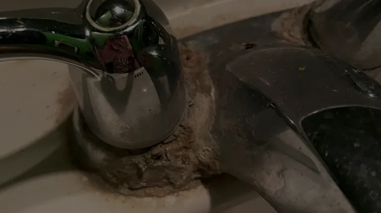 a dirty faucet in a bathroom sink