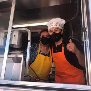 a woman in a chef's hat on the side of a food truck