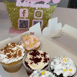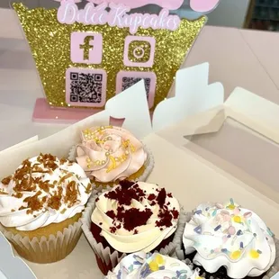 The outdoor signage was very appealing and cute. The inside looked clean and cute as well. We had an assortment of cupcakes. They were decorated nicely, with sprinkles and cake crumbles. Once we got home and tried them out, they were okay. Nothing over the top, a little bit dry, and the frosting had minimal flavor. I did appreciate that the frosting was not too sweet. Overall okay, nothing fabulous but also nothing bad to say. I did really enjoy the space.