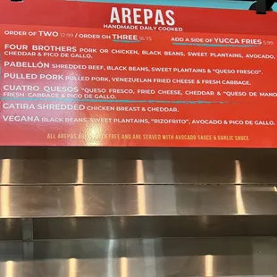 You can order 2 arepas for $12.99 and add a side of yucca fries for $5.99. We got the four brothers arepas and Pabellon with sweet plantains and yucca fries. I was a little disappointed that we paid $5.99 for 4 small (around 4 inch size) pieces of yucca fries. They were really delicious though! The arepas were yummy. The size of the arepas are slightly larger than your typical burger sliders. I loved the crispy corn flavor of the arepas. The meat filling was juicy! They also had really unique sauces. The menu is straightforward. Our order took 10 minutes to come out. This restaurant is located in a dining hall that includes a handful of other restaurants (including a dessert gelato place)! There is corn hole set up outside of the dining hall. Parking is free for 1 hour at the parking lot across the street of the restaurants.