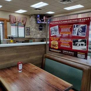 Nice rustic indoor ambiance. Very friendly and helpful staff. The service was fast. The food was great!!! I had the double frontier burger. Nice flameboriled flavor. Very good and juicy burger. I also had fries and a tortilla soup what was very good as well.
