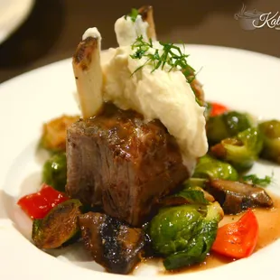 Braised Venison with summer ratatouille and goat cheese.