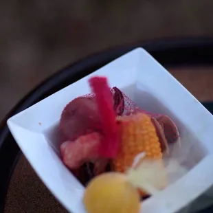 Fried oyster nacho on yucca chip with guacamole passed hors doeuvres