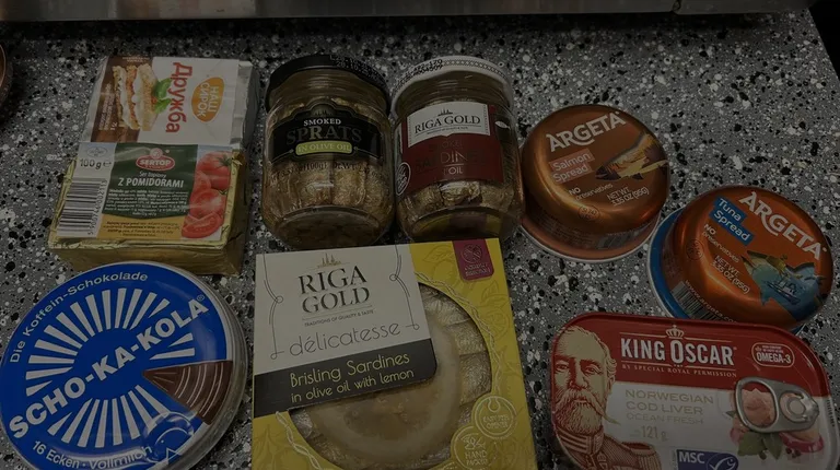 A lot of natural Russian canned fish