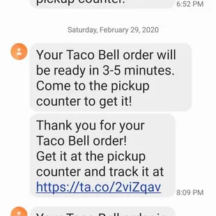 Ordered on a app 3 times. First time, no issues. The other 2...forget it!! Said order would be ready in 3 - 5 minutes. Hubby jumped in the car to go pick it up because it's a 3 - 5 minute drive. Food was ready in 19 minutes. Why? No excuse to wait for food for 19 minutes at any fastfood restaurant. If you notice, it was 17 minutes the time before and our notification said 5 - 8 minutes. If you can't accomodate, as promised, do away with app orders.