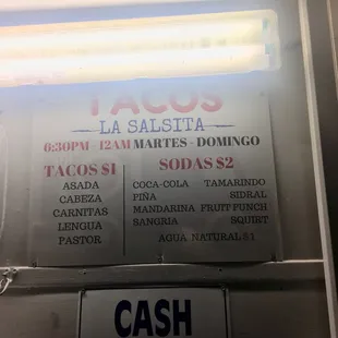 These are by far the best tacos in San Antonio! Worth the drive! The salsa they give you had a kick to it but it's flavorful and they have self serve limes and jalapeños. The tacos are $1.50each with choice of asada, pastor, cabeza, and another that I can't remember. They come with onions and cilantro if you like. The tacos are always consistent and the guys are always nice.