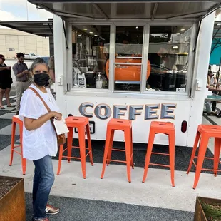 orange stools in front of a coffee truck