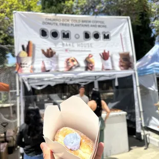 "HAVE A BOM DAY" lol(3.7 stars)Aimlessly searching for baked goods or morning pastries at the market and stumbled on this booth. They have a shop in South Bay but I did not know the vendor at the farmers market although I've always wanted to try their churros, I can settle for them donuts. Obviously, go early because they do have limited supply and weather can impact the togetherness of the pastries. Quite a few to pick from but the three that caught my eyes were 1) PEACHES AND CREAM - sugar donut filled with cream and a big slice of peach. Although this was basically a stuffed cream donut with one big peach, I appreciate the peach because there isn't enough peach flavored filling donuts out there. HIGHLY RECOMMEND2) HAZELNUT - sugar donut stuffed with hazelnut chocolate (aka Nutella). This is the basic and safe one to order if you don't know what to order.3) CHOCOLATE COVERED - another safe one. Chocolate coated sugar donut stuffed with cream. Very similar to a bombillini and malasadas; those have custard and i prefer custard over cream inside my donuts. They did hold up (not melt) as I strolled through the market and head home. I wouldn't say the same if it was summer! Perhaps, next visit I can just settle for one instead of 3 or hopefully if available get only the churros.