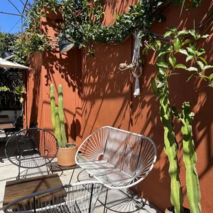 a patio with chairs, tables and cacti