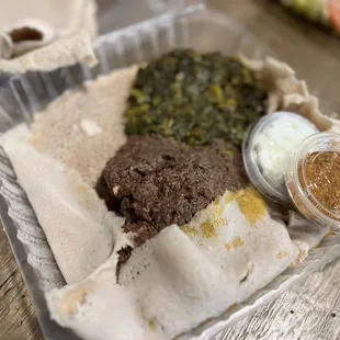 "This was my first time trying Eritrean food and it was so absolutely stunning!! I started with the Asmara lager, easy to drink and smooth. I crushed two meat sambusas - the sauce is a little spicy but I couldn't get enough. The veggie platter for 1 comes with a soft injera, tumtumo (crushed lentils seasoned well), hamli (seasoned collard greens), alicha (seasoned potatoes with other veggies), alich-ater (yellow split peas with other veggies). It was a pleasant surprise to eat with my hands, scooping bites of the veggie platter using the injera. It's similar to how I eat Indian food at home! It was so delicious, seasoned well, and exceeded expectations. The service at the bar was amazing- very prompt and warm energy. The space is loud, crowded with lots of folks sharing plates. It's lit with warm yellow-orange lighting. I am def brining friends and family back!"