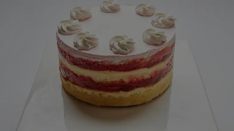 Strawberry Charlotte strawberry mousse wrapped in poppy seed basil ladyfinger cake with dried strawberries