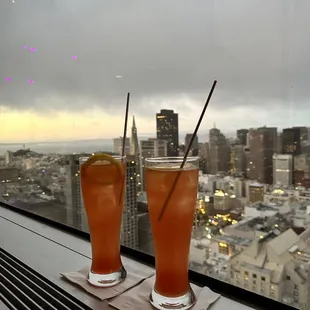 Beautiful views of the cityOn 46 floor- go to tower 1 elevators Drinks are expensive but a little cheaper than at other rooftop bars such as The View Friendly serverNote- they do not have any hot tea or coffee (wanted something warm on a cold evening)Theyre nonalcoholic drinks are about $15 and glasses of wine start about the same
