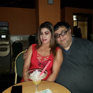 a woman in a red dress at a bar
