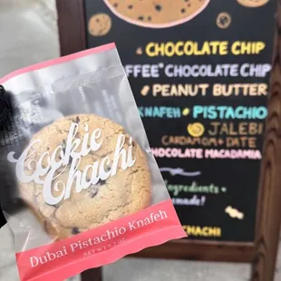 Really nice owner. Their cookies are made from the night before and are individually sealed. Each cookie is $5.50 except for the Dubai inspired as that's $7. If you've had Dubai chocolate before you will be disappointed by this cookie. I had to wonder if they packaged the wrong cookie because it just tasted like a salted chocolate chip cookie. There was no crunch from the kataifi and no taste of any pistachio cream. I also tried their cardamom and date cookie and that was good. I love cardamom and really enjoyed it.