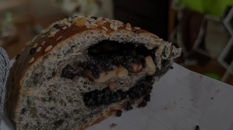 Lots of black sesame paste and walnuts in this bun. Yum