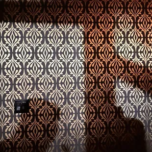 Dimly lit bar with a working fireplace in the middle behind a lounge couch. Drinks were okay. This vulva inspired wallpaper is cool though!