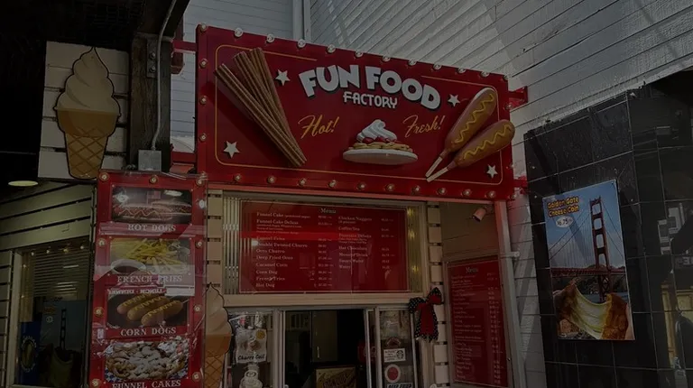 I'm usually not looking out for junk food but when you're on Pier 39, definitely stop by Fun Food Factory! This little hole in the wall serves up generic, hearty junk food at a pretty quick pace.I decided to order a funnel cake to share with some friends as well as a corndog. Funnel Cake: Nothing special. Just a very solid funnel cake. They are freshly made (surprisingly some places just have pre-frozen ones) and comes with whipped cream and strawberries. Everything meshed well together and it makes for a great treat :)Corndog: Just a standard corndog. Freshly made to order and a decent portion size