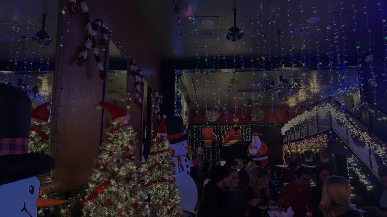 View from the side of the bar. Lights on the ceiling sync with the Christmas Carols playing on the big screen in the back.