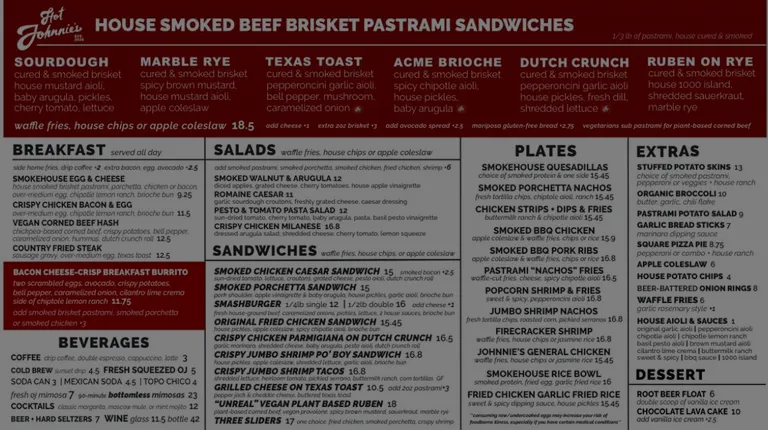 As much as I admired my 2021 review of Hot Johnnie's, today's visit proved that it's time for an update. Hot Johnnies is now Hot Johnnie's Smokehouse and lots else has changed since my previous visit: The menu, which I'd previously have described as "all Pastrami all the time" (in a good way) is far more varied now. Varied enough, actually, that I'll probably stop telling people to "go to the pastrami place". The other reason I'll stop telling them that is this: During today's visit the kitchen was 100% out of pastrami. What? Well, that pretty much derailed our plans. The folks I came with still wanted to stay (it'd been my suggestion... for pastrami) and here's what we ordered instead: * Smoked Porchetta Sandwich* Original Spicy Fried Chicken Sandwich* Waffle-Cut fries &* Walnut & Augula Salad (with Fried Chicken)Try not to hear "we all wanted pastrami" when I tell you that the person who ordered the Porchetta Sandwich preferred the Fried Chicken Sandwich and the person who'd ordered the Fried Chicken Sandwich preferred the Porchetta Sandwich. As usual, I was the one with the salad which was good and satisfying but I kept wanting the fried chicken to have some more flavor than it did. I think we all just wanted the pastrami. Since my last visit the back patio seating (the only seating) has been covered in see-through plastic which, on a day as warm as today, really left us emphasizing the "hot" in "Hot Johnnie's". It was like a sauna, with no cross ventilation at all. Worse, most tables were getting sun; when a table with some shade opened up we quickly moved. though the stagnant air remained. I still like what Hot Johnnie's is putting out but I now have some caveats for future visits: 1) Stay only if they have pastrami and 2) Dine-in only if it's a cold day. It'd be nice if some tables were available outside of the covered space but right now that's where the ping pong table resides. Oh, that's right: they still have ping pong and board games.