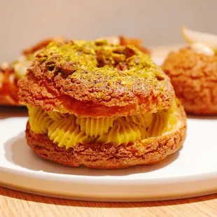 The mandarin black sesame croissant was freaking amazing! It has a honey sweetness to it, not overly sweet but just sweet enough and it was filling! The croissant was flavorful and crunchy throughout with dried candied mandarins on top and a black sesame paste inside. Would definitely order this again!Tried the Choux de Saison which I don't know what it was, had a little worm looking squirt on top with a gold flake. The whipped cream filling tasted like sour cream to me. The dough was superior to other cream puffs Ove had but I didn't enjoy anything else about it.The line was not bad at all! The only thing is there is a sign asking folks to wait outside while they serve each group and I don't think everyone read us the sign so while we were waiting folks just kept walking in and standing inside. Thankfully one couple let us cut the line to make up for those who cut in front of us. But overall a really cool spot and I want to go back to try more.