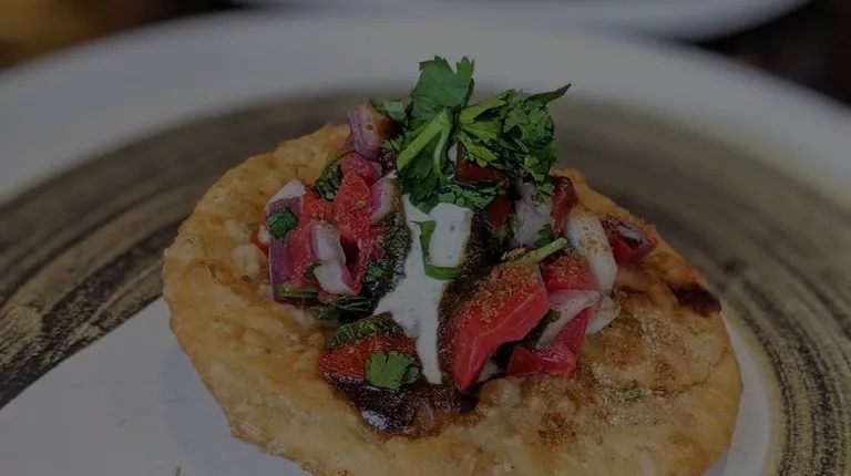 Tamarind chutney, kachori chaat, chickpeas with crispy spinach, flatbread, basmati rice