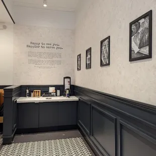 Optional private seating with cool art backdrop.