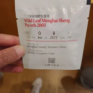 The tea we sampled (Wild Leaf Menghai Sheng Pu-erh, 2003)