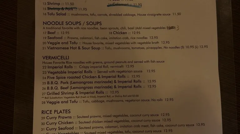 I decided to return to this location after they have been closed for some time. As I was looking at the menu, the waitress took my menu away. She even looked back at me after the fact. Very rude. I wanted to order my usual Vietnamese Hot n Sour soup that is still listed on the menu, but was informed they no longer make it and had me try a Chinese Style hot n sour soup. Authentic Vietnamese Restaurant is false advertisement. I was willing to order the 5 spice chicken and had my Visa out, but due such inconsiderate service, I lost my appetite and walked out. This location was my go to before they closed for that temporary period of time.