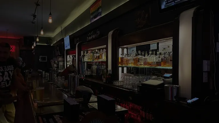 a bar with a rainbow flag hanging above the bar