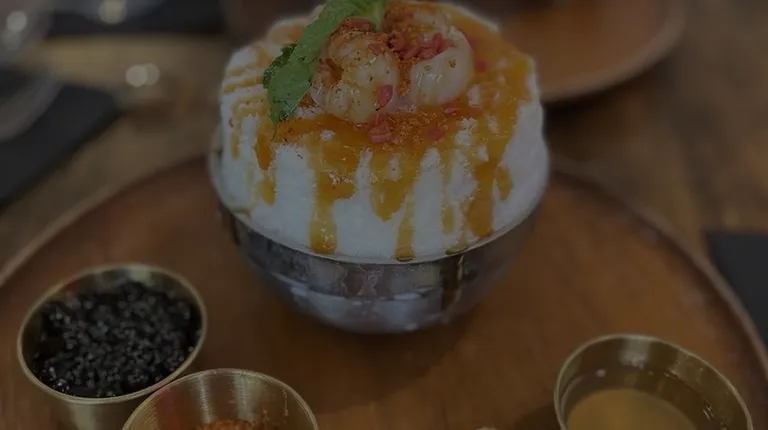 Mango Sticky Rice Bingsoo: Korean snow ice w/ homemade crumble, pandan sticky rice, mango purée, condensed milk | $18