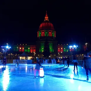 Another Holiday season has fallen upon us and San Francisco is now lucky to have ANOTHER outdoor Ice Rink to enjoy!I'm sure you've probably skated at the Union Square rink or in front of the Ferry Building at Embarcadero.Now, you can skate under the glowing City Hall lights at Civic Center Plaza!The rink officially opened November 30 and I've already been twice!It is much larger than the one at Union Square, but smaller than the Embarcadero one.However, this ice rink features something brand new that the other two rinks don't have-a 400 ft skate track that you can skate & weave through the lighted forest!It is also the most pricey ice rink of the 3...$20 for Adult admission including skate rentals.Like the others, all skate sessions are 90 minutes and start on every even hour.The first time I went during the day at 2pm, I was the only skater on the ice at one point (not counting the employees!) It was fun to have all that room to twirl and spin and do whatever I want, but it was sunny out and a bit warm, so the ice was a little slippery from melting a bit.The second time I went was on a Monday night 8pm. I brought 20 of my friends and we took over the ice rink! Once again, we were the only group on the ice, minus a couple kids who left early. Since the rink is new and fairly empty compared to the others, the ice has been well maintained and very smooth, with little holes or bumps. Skate rentals go all the way up to a men's size 15, but they offer a $5 discount if you bring your own.Also, unlike the other rinks, this ice rink has an ON-SITE BAR. WOOHOO! So you can enjoy a glass of wine or champagne to loosen those muscles and conquer those fears!As your skate session winds down, don't forget to snap a few photos of you and your friends/family in front of the lighted Christmas Tree that glows in front of the illuminated City Hall! The perfect photo op!Tis the season for ice-skating, can't wait to go back!