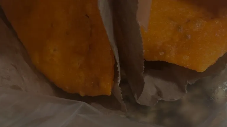 Inside of Ilocano empanada (ground pork, egg, and pickled papaya)