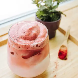 a glass of iced tea and a potted plant