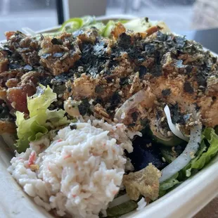 Used to be one of my favorite poke spots in the bay, and would even drive 30 min out of the way for it, but been recently disappointed with their price and portion sizes. Ordered a large which comes with 5 scoops of protein. Most other poke spots (shoutout poke house) uses regular ice cream-sized scoopers but go fish poke has swapped out theirs with tiny ones that ive used before for bite size cookies. I will say, however, that the taste is still fresh, and toppings provide a satisfying crunch to an otherwise fatty protein. Just don't be alarmed to feel a little under-satisted for a ~$20 meal