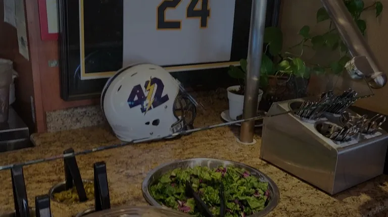 a salad bar with a helmet on it