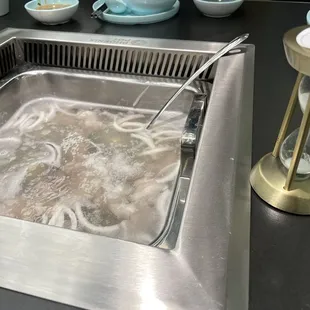 We came on a weekday for lunch and there was no wait and very few other parties. The ambiance is kind of tech-y with metal and neon. It seemed like a good place for groups of up to 6. We had the pork belly chicken soup and the coconut chicken soup, which is sweet. I'd never had a sweet hot pot soup before, and it was interesting! The soup has coconut water and pieces of coconut. Tip: corn on the cob tastes so good cooked in that coconut water soup! Both soups come with a lot of meat that you can scoop out to eat after it's been cooked. The biggest downside was that the meat is all bone-in, which makes the soup delicious, but the bones were crushed and I crunched tiny bone shards more than once, which can't be good for my teeth. They charge $1.50 for the sauce bar.The chopsticks are really interesting! The handles are reusable and the tips are disposable wooden pieces that you screw in to them. I like this system since wood is grippier but less hygienic. The service was really nice here-- they switched out our bowls for us when they got full with bones. We stayed a pretty long time and they were okay with it.